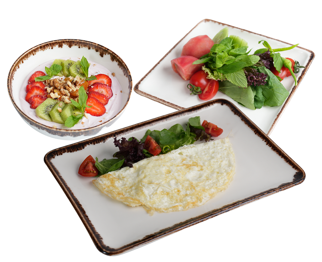 Sağlıklı kahvaltı meyveli yoğurt yumurta beyanında omlet çeri domates salatalık yeşillik tabağı