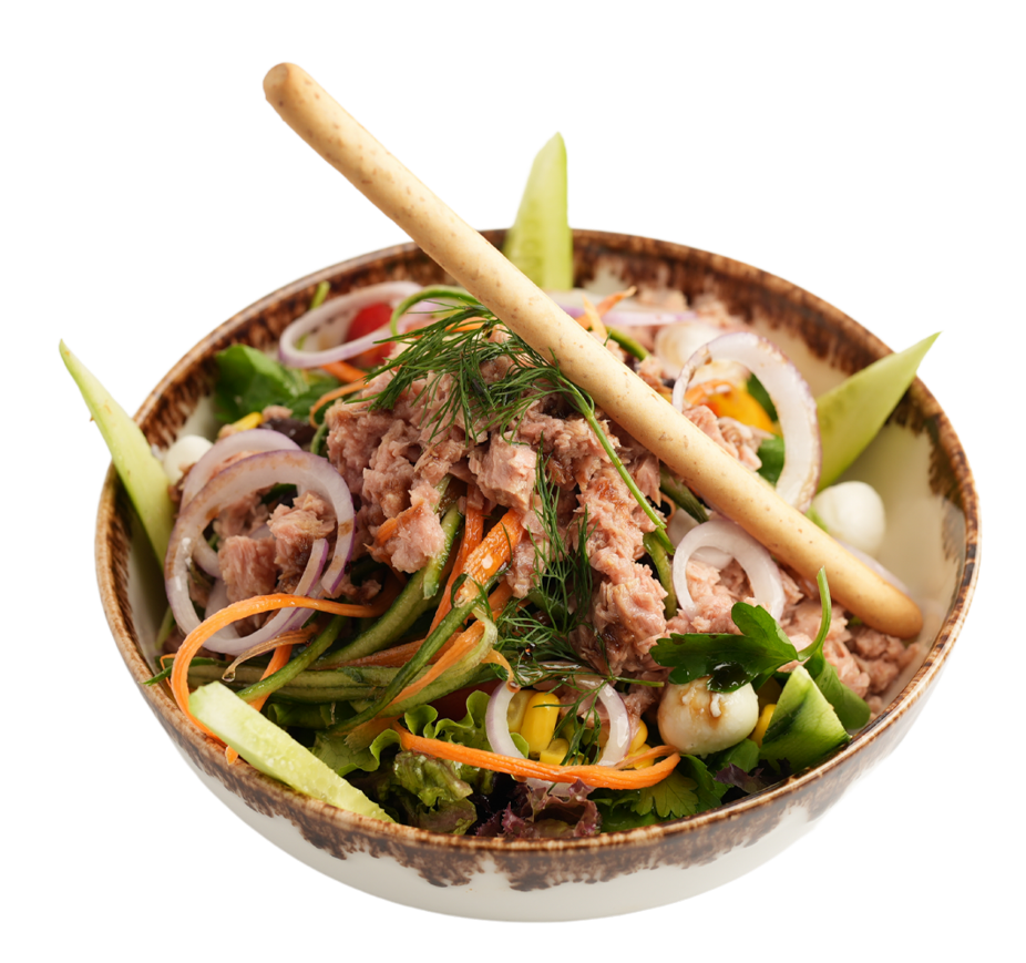 Akdeniz yeşillikler, tonbalığı, mısır, soğan ve özel sos ile