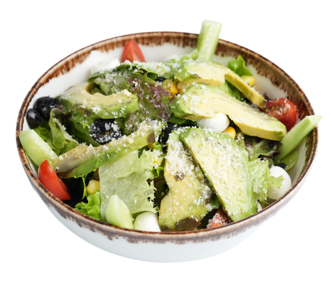Akdeniz yeşillikler,mısır, Avokado süt damlası peynir, zeytin, çeri domates ve salatalık